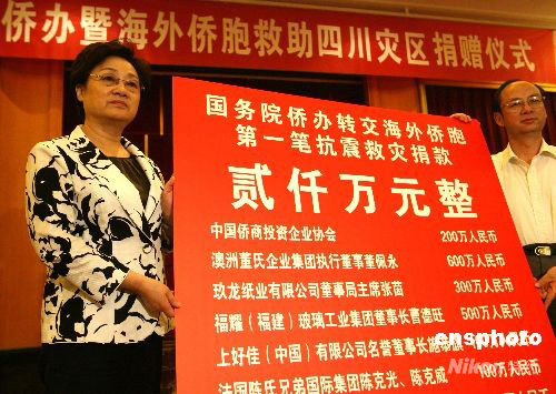 国务院侨办主任李海峰5月15日下午与全国政协委员、中信二十一世纪(香港)有限公司执行副主席陈晓颖女士飞抵成都,李海峰向四川省政府转交了海外侨胞捐赠的第一笔抗震救灾资金二千万元,陈晓颖女士向灾区捐赠了价值两千万元的通讯设备,四川省政协副主席陈杰代表四川省政府接受了捐赠。