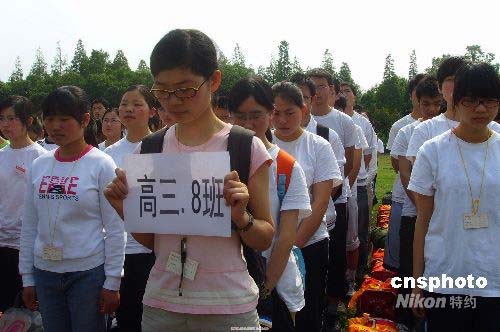 5月19日上午10点,在北川中学高三学生复课仪式上,同学们默哀悼念故者。