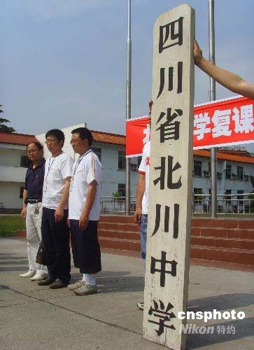 复课仪式上,北川中学的校牌由师生手扶重新屹立。