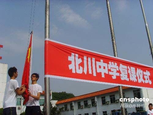 复课仪式上,五星红旗在同学们的国歌声中冉冉升起,降半旗向地震遇难者致哀。同学们重新返回课堂,用坚强的意志备战高考。