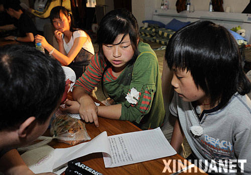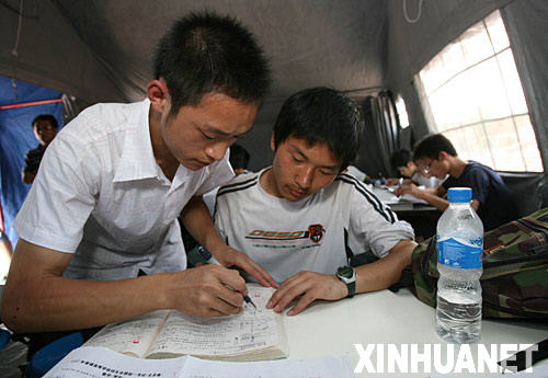 5月20日,来自北川的一年级小朋友王佳雯正在听课。 当日,四川绵阳灾区九洲帐篷学校在绵阳地区最大的灾民安置点――九洲体育馆内正式开课。 5月20日,学生们在课堂上踊跃举手发言。当日,四川绵阳灾区九洲帐篷学校在绵阳地区最大的灾民安置点――九洲体育馆内正式开课。 5月20日,灾区孩子在“帐篷小学”上课。当日,由济南军区某红军师官兵创建的“帐篷小学”正式开课,这所简易学校名为“铁军抗震学校”,40多名学生都来自灾区都江堰市青山镇泰安村。 5月19日9时30分,在汶川大地震中受灾严重的北川中学高三学生在位于四川绵阳市的长虹培训中心举行复课仪式。 5月19日,北川中学高三年级学生进入教学点上课。 5月19日,映秀镇漩口中学初三年级的王霞(左一)正与同学在成都医学院的临时宿舍内聊天。 5月19日,映秀镇漩口中学初三年级的学生正在成都医学院的临时宿舍内进行个人信息登记。 5月19日,语文老师在辅导二年级的小学生。当日,从地震重灾区北川县徒步转移到绵阳市南山中学的107名小学生全部在帐篷学校里复课。 5月19日,四川绵阳南山中学高三年级的学生王道德(左)与同学研讨练习题。南山中学组织部分无家可归的在校学生和接收的北川县转移而来的学生共计200余名开始地震后的第一堂课。
