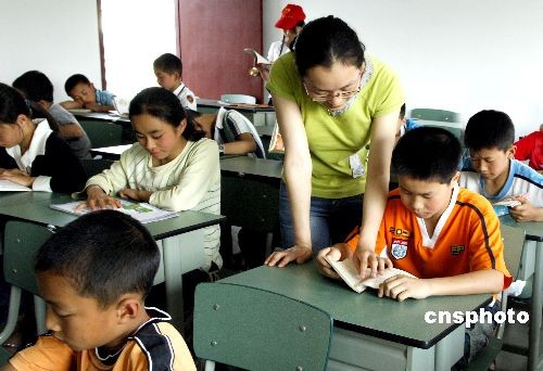 5月19日,来自地震重灾区的孩子在四川省成都市新都区“爱心学校”的课堂上接受老师辅导。全国首所专门为地震重灾区孩子开办的“爱心学校”,18日上午在四川省成都市新都区新繁镇正式开课。首批就读的166名孩子,分别来自彭州、都江堰、绵竹等重灾区,有的孩子在震灾中失去了父母。新都区从各个学校抽调了近20名经验丰富、有敬业精神和爱心的教师任课,并给学校安排了2名有资质的优秀心理健康辅导老师。