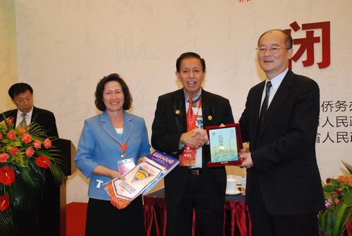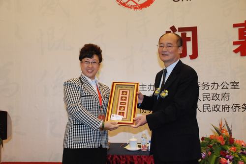 国侨办副主任赵阳接受与会代表赠送礼品