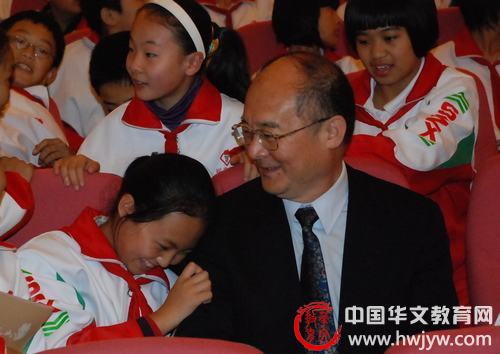10月21日晚,世界华文教育大会举办首届中华文化知识竞赛总决赛,国侨办赵阳副主任与来参加活动的成都树德中学的小朋友亲切交谈。