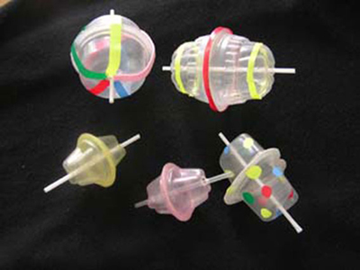 2、幼儿人手一个果冻陀螺,尝试在不同的材料上转动陀螺,观察陀螺在哪些材料上会转,哪些材料上转的时间长,提高观察、概括能力。