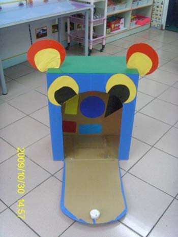 【玩法】幼儿在一定距离内,用沙包或报纸球向动物头饰内的图形进行投掷,打中后说出击中图形的名称,看谁打得准、说得对。
