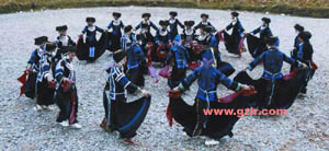 另一种板凳舞蹈是参加舞蹈之人每人双手各持一只凳子,集中在较宽的坝子上,一起围着圈子转跳,舞蹈动作是先走右脚用脚踉向外、前点两点,与此同时双手的板凳也击两下,之后收左脚向内、前点两点,双手板凳也即拍两下,如此反复几遍后。圆圈队形又逐渐转换为面对面并列两队形。舞蹈动作基本同前,舞时两对面伸出有手持板凳相互击一下,又换左手相互击一下,二人在作这两个动作时,各自的右、左脚跟也互换点地。之后,面对面各自转身向外斜成“弓”字形击了两下,与此同时二人屁股相撞,百褶裙子飞扬。如此反复几遍后,各人又边击板凳,双脚同时起跳如蛤模跳跃状,一边手击板凳,一边与其它舞蹈妇女用臀部东击西碰。如此反复狂舞,直到兴尽方休。
