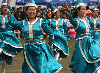 节日里,妇女们精心梳妆后纷纷去参加“鲁日该勒”歌舞晚会。她们一个个身着色彩鲜艳的绸缎长袍,足穿绣花鞋,头上戴着美丽的花朵,把自己打扮得容光焕发,就连八十高龄的老奶奶也穿上最漂亮的长袍,在儿孙的搀扶下兴致勃勃地前去赴会。晚会多在房屋宽敞的人家举行,炕上炕下,屋里屋外到处挤满了跳舞和围观的人们。晚会开始多由德高望重的长者成对起舞,接着善舞者邀请对手,首先拉着手,悠摆臂膀唱着曲调悠扬的传统民歌,唱过一、二首后,便转入边呼号边跳舞的段落。呼号声此起彼伏,步履快,随着急促的呼号和不断更新动作,形成炽热欢腾的竞舞场面。此时如若一方没跟上变化的动作或呼号,就算输给对手。男子和孩子们多为观看助兴,很少下场跳舞。