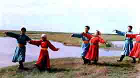 鄂温克族人民喜爱歌舞,不论居住在山上还是山下的人们,在劳动之余或节日之时,用歌舞形式抒发情感是大家习以为常的事。生活在农牧区的鄂温克族中,有着专供妇女们自娱的游戏性舞蹈《奴该里》。舞蹈时一人为领舞,以一脚脚跟着地,紧接脚掌拍打地面的同时,另一脚踏地跟随的步伐贯穿于全舞,并不断即兴地变换各种模拟生活的姿态。如一手在额前搭凉棚,另一手反叉腰的“了望”姿态;全蹲双脚蹦跳,两手交替做一手叉腰一手揪自己耳垂,模拟“戴耳环”等舞姿和动作,然后由其他人边歌唱边模仿。为了加强舞蹈的欢快气氛和节奏感,领舞者还不时地带领大家呼喊“阿罕拜”、“得辉达”“罕达、罕达”等口号,使舞蹈更加刚健有力和富有情趣。动作速度的递增和模拟姿态难度的加大,定会有人逐渐跟不上领舞者的动作而败阵下来,受到事先规定好的惩罚。